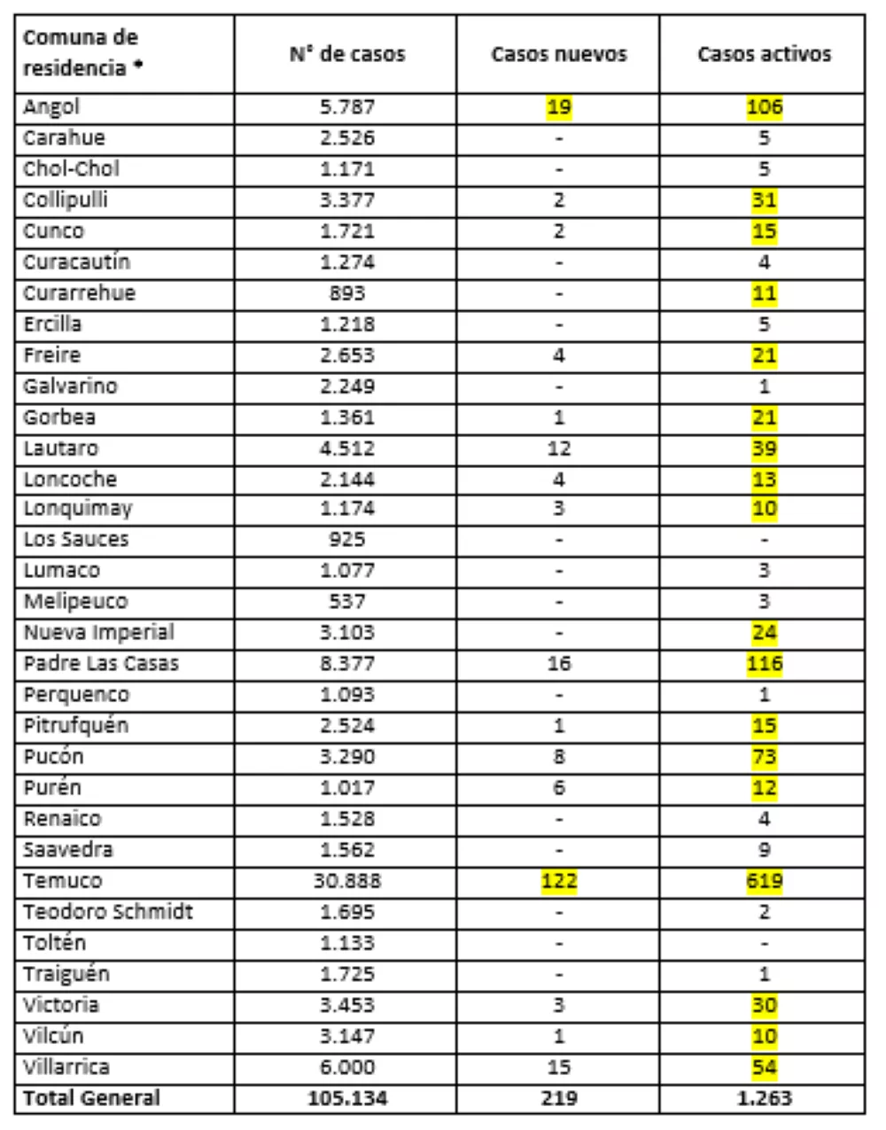 Con estas cifras, 18 comunas de la región se ubicaron con sobre 10 casos activos, Angol (106), Collipulli (31), Cunco (15), Curarrehue (11), Freire (21), Gorbea (21), Lautaro (39), Loncoche (13), Lonquimay (10), Nueva Imperial (24), Padre Las Casas (116), Pitrufquén (15), Pucón (73), Purén (12), Temuco (619), Victoria (30), Vilcún (10) y Villarrica (54).