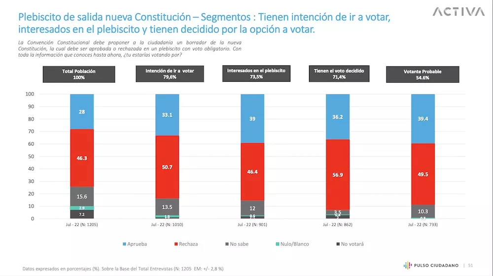 En dos escenarios distintos de la encuesta Pulso Ciudadano ganaría la opción que rechaza la nueva Constitución, opción que se consolida a medida que pasa el tiempo y comienzan las campañas a favor y en contra del nuevo texto constitucional.