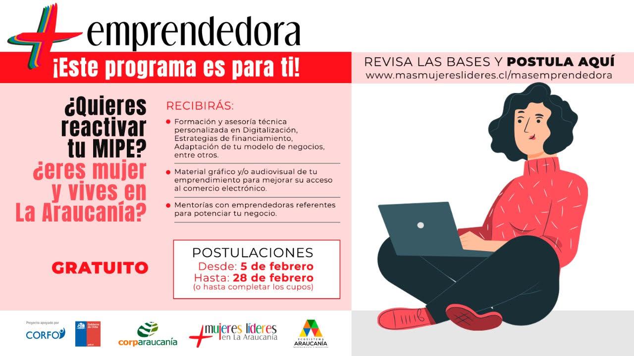 En el contexto de la crisis sanitaria provocada por el Covid-19, que ha afectado de manera transversal y en múltiples dimensiones a la región, Corparaucanía, con el apoyo de Corfo y la colaboración de la Corporación Más Mujeres Líderes en La Araucanía, invitan a participar del programa +Emprendedora.