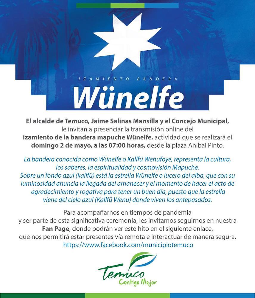 El izamiento de la bandera mapuche o Wunelfe, en la plaza Anibal Pinto, frente a la municipalidad de Temuco, ha generado una serie de críticas desde que se anunció, las que hasta ayer eran principalmente por el horario escogido para la actividad, hoy domingo a las 7 de la mañana. Sin embargo, ayer manifestó su oposición el candidato a gobernador regional Aucán Huilcamán.