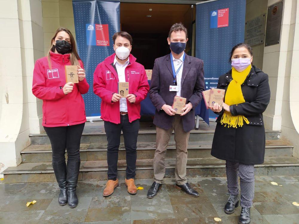 La seremi del Ministerio de Desarrollo Social y Familia, Consuelo Gebhard, junto a la representante nacional de Asuntos Indígenas de esta cartera, Ana Millanao, hicieron entrega de 60 ejemplares de Diccionarios Indígenas editados por el MDS al seremi de las Culturas, las Artes y el Patrimonio de la Araucanía, Enzo Cortesi, y al director regional del Servicio del Patrimonio Cultural, Roberto Concha, en el contexto del Día del Patrimonio Cultural.