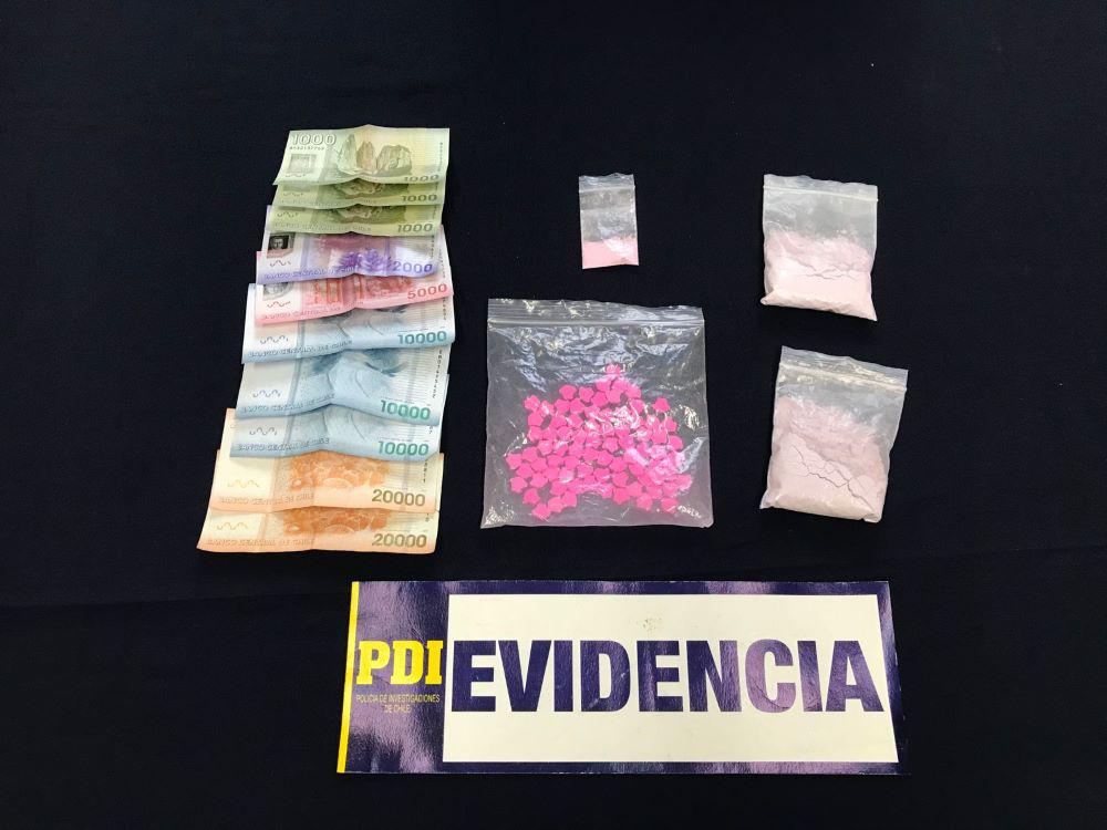 Al interior de su maleta, trasladaba 80 comprimidos de éxtasis (MDMA), más de 57 gramos de ketamina (tusi), además de 85 mil pesos en efectivo.