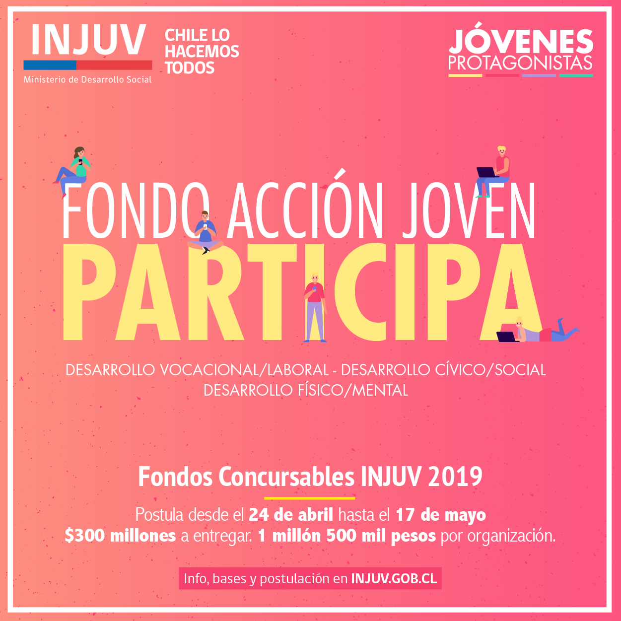 Las bases e información están disponibles en http://www.injuv.gob.cl/noticias/fondo-accion-joven-participa-2019-injuv postulaciones hasta el viernes 17 de mayo de 2019.