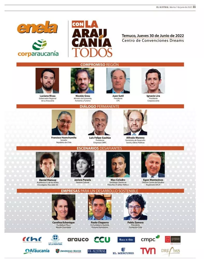 El único considerado en una región con más de un 30% de habitantes indígenas fue el senador Francisco Huenchumilla, quien se excusó por encontrarse con Covid. Sin embargo, no se incluyeron otros oradores de la etnia mapuche en la versión denominada "Con La Araucanía Todos".