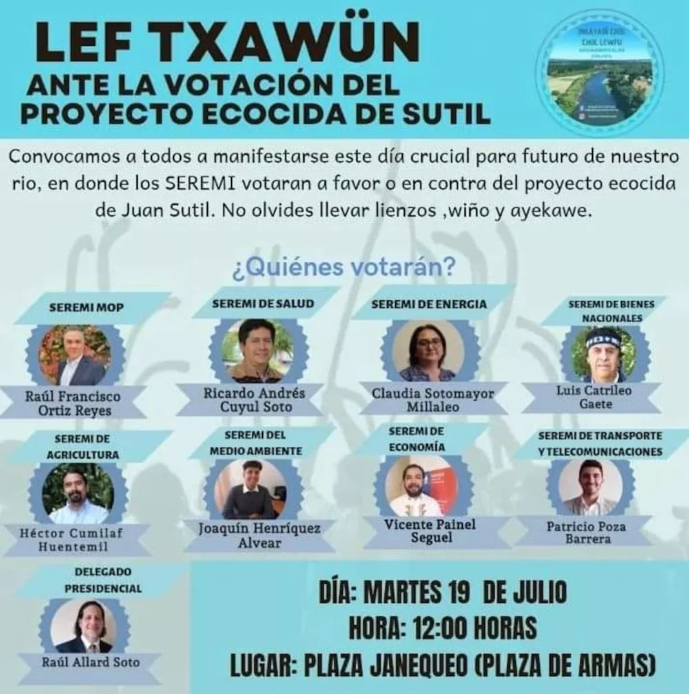 "... la tramitación administrativa del proyecto esta en su fase final y eventualmente tendrá que ser votado por nueve secretarios ministeriales de la región (seremi) entre los cuales existen mapuche, por lo que el mensaje es claro; tendrán que decidir y optar entre la vida o el ecocidio, tienen una doble responsabilidad si bien cumplen una función pública, deben tener un compromiso ético con el pueblo mapuche", agregaron.