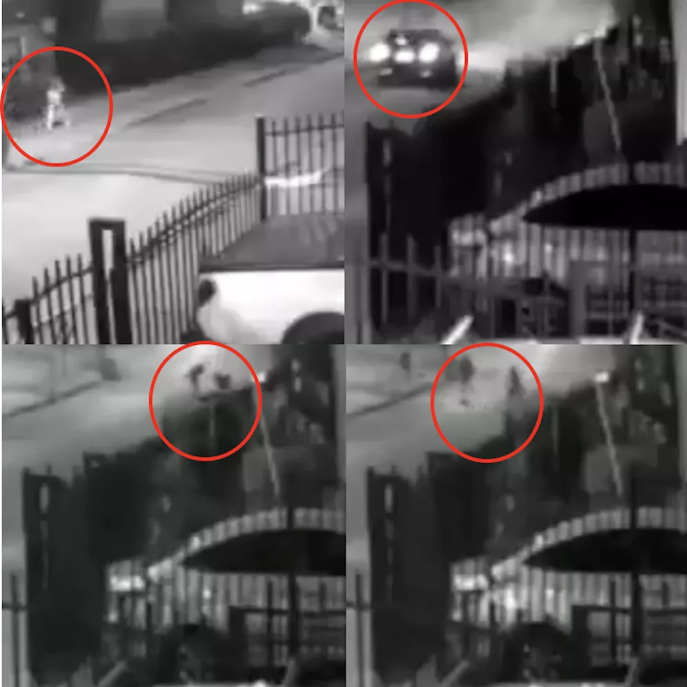 En el video se puede apreciar cómo, en la parte superior de la pantalla, luego de que pasa una mujer sigue un vehículo que se detiene y que intenta subirla al automóvil. Ella se resiste gritando y es arrastrada por los dos antisociales, hasta que un vecino se percata y activa su alarma.
