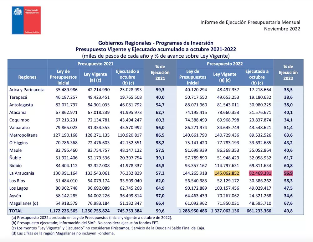 Malas cuentas se sacan en la Gobernación Regional, ya que finaliza el mes de noviembre y la ejecución presupuestaria regional no logra mejorar sustancialmente. Del total de presupuesto disponible para La Araucanía, según datos de la Dirección de Presupuestos de la Nación (Diprés), DIPRES NOV 2022.pdf, a octubre sólo se ha ejecutado un 56,9% del total presupuestado para este año 2022.