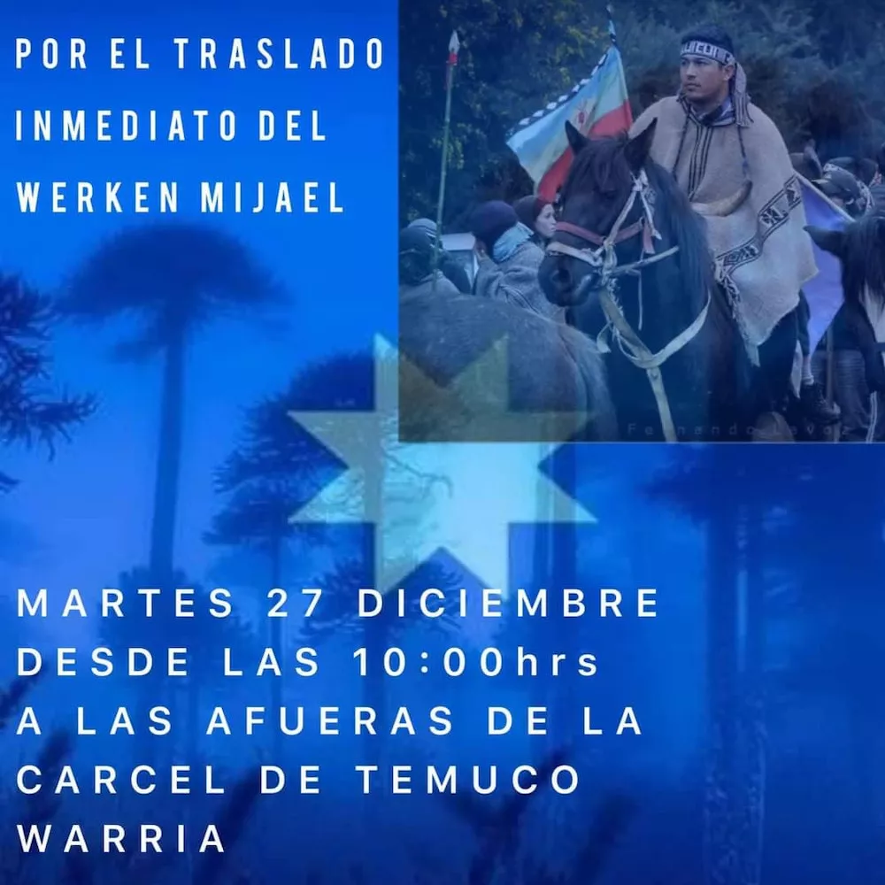 "La familia del werken hace un llamado a todos los territorios en resistencia y las personas conscientes con la lucha a hacer presión el día de mañana Martes 27 de diciembre a las afueras de la cárcel de Temuco desde las 10:00 hrs, con el fin de exigir el traslado INMEDIATO del werken Mijael al “módulo de comuneros”", sigue el texto, a través de cual se hace un llamado a concurrir hoy, a contar de las 10 de la mañana, a manifestarse a las afueras de la cárcel de Temuco para exigir su traslado dentro de la misma unidad penal.