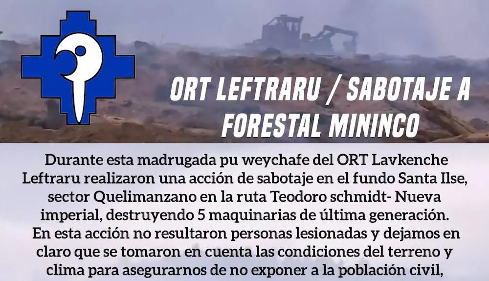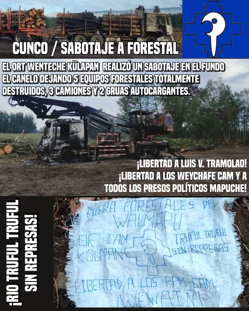 "El ORT wenteche Külapan esta madrugada realizó un sabotaje en el fundo el Canelo dejando 5 equipos forestales totalmente destruidos, 3 camiones y 2 gruas autocargantes", informaron a través de un comunicado los responsables del ataque incendiario.