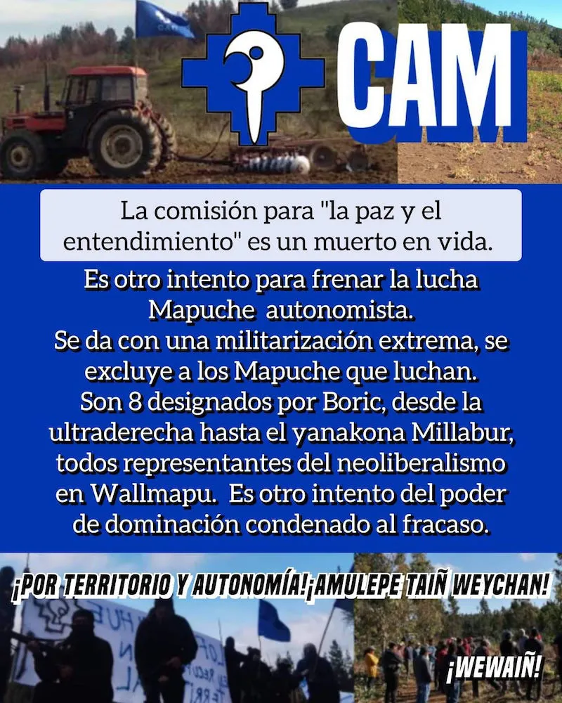 "La Comisión para la "Paz y el Entendimiento" es un muerto en vida. Es otro intento para frenar la lucha mapuche autonomista. Se da con una militarización extrema, se excluye a los mapuche que luchan", manifestaron desde la CAM.