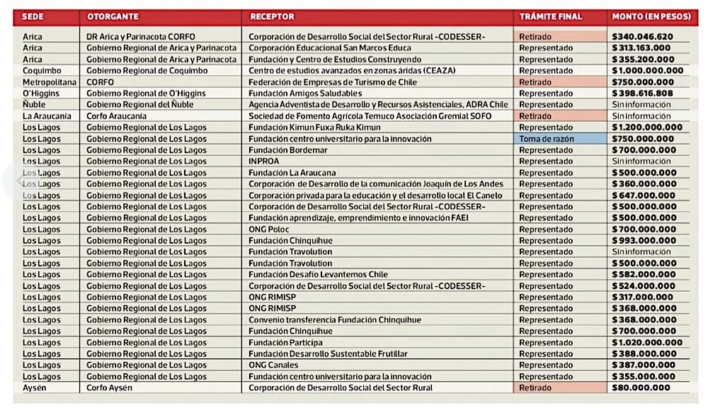 De acuerdo a información que logró obtener La Tercera, desde el interior de la Contraloría General de la República, este ente fiscalizador declaró ilegales o "representó" (el término legal), convenios por $13 mil millones entre el Gobierno Regional de Los Lagos u otras reparticiones públicas, con fundaciones y corporaciones beneficiadas.