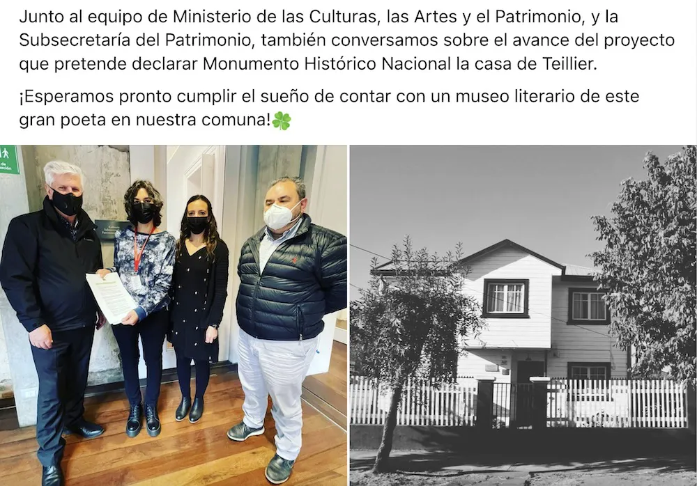 "Junto al equipo de Ministerio de las Culturas, las Artes y el Patrimonio, y la Subsecretaría del Patrimonio, también conversamos sobre el avance del proyecto que pretende declarar Monumento Histórico Nacional la casa de Teillier. ¡Esperamos pronto cumplir el sueño de contar con un museo literario de este gran poeta en nuestra comuna!", agregó en la publicación.