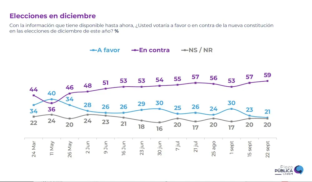 De acuerdo a la encuesta Nº 506 de Plaza Pública Cadem, correspondiente a la tercera semana de septiembre de 2023, un 59% votaría en contra en el plebiscito constitucional a realizarse en diciembre próximo y sólo un 21% votaría a favor, el nivel más bajo desde marzo.
