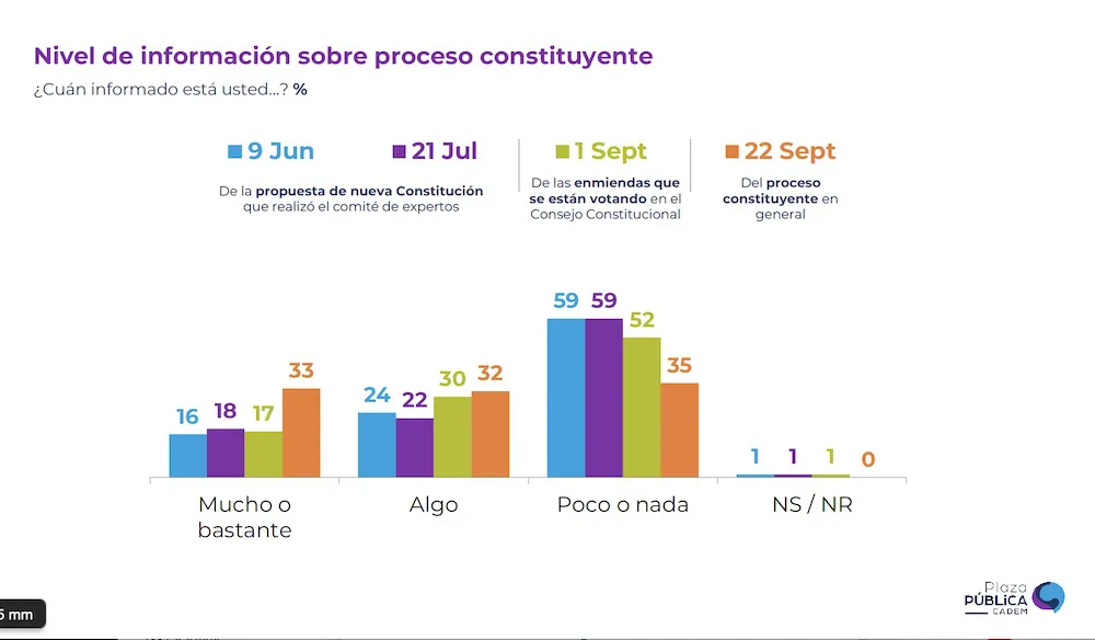 Sin embargo, este 21% que votaría a favor de la nueva Constitución es menor incluso frente al 33% que conoce "mucho o bastante" el texto que se debate hoy y donde un 32% lo conoce "algo" y un 35% "poco o nada".