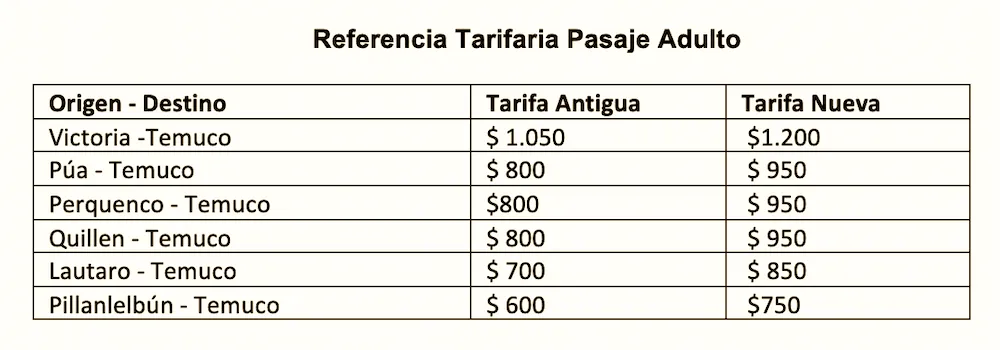 Hernández, explicó que, por ejemplo, en el caso del tramo Victoria - Temuco, que actualmente tiene una tarifa de $1.050, quedará en $1.200. De la misma forma, Lautaro -Temuco pasará de $ 700 a $850, valores que, a pesar del alza, siguen siendo más económicos en comparación con el transporte público tradicional de la región.