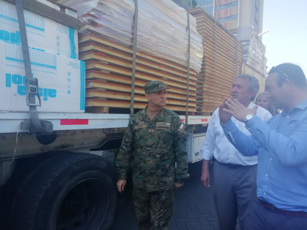 Fue el intendente Jorge Atton, junto al general Rodrigo Pino y autoridades regionales, quienes dieron la bienvenida a los camiones que portaban el material para reconstruir las viviendas, de un total de 23 que llegarán a la región, mientras se construyen las casas definitivas.
