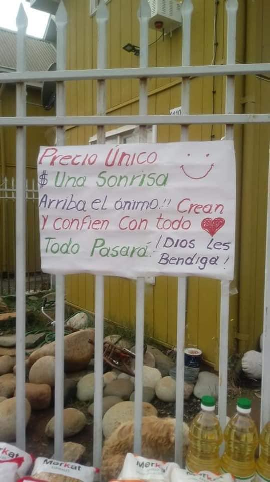 "Precio único: una sonrisa", con un letrero puesto en el cerco de una casa, los pobladores de la villa Portal Nuevo Horizonte, de Pedro de Valdivia, se unieron para apoyar a los vecinos que hoy no tienen trabajo y no han podido llevar comida a sus familias, producto de esta pandemia que ha significado una importante reducción del ingreso para las familias del sector.