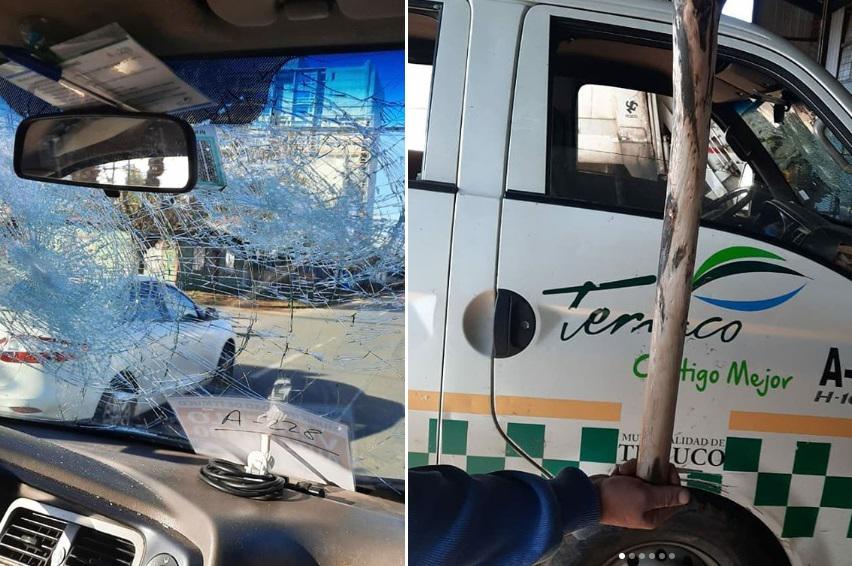 "Con mucha tristeza informamos que uno de nuestros vehículos municipales deberá restarse de circulación tras sufrir un cobarde ataque en la intersección de las calles Luis Durand con Huentenao Millanao de Temuco, por parte de un grupo de desconocidos provistos de palos, en momentos que dos funcionarios a bordo se dirigían a prestar servicio de recolección en microbasural de calle Totoral con Colón, sector Pedro de Valdivia", informó la municipalidad.