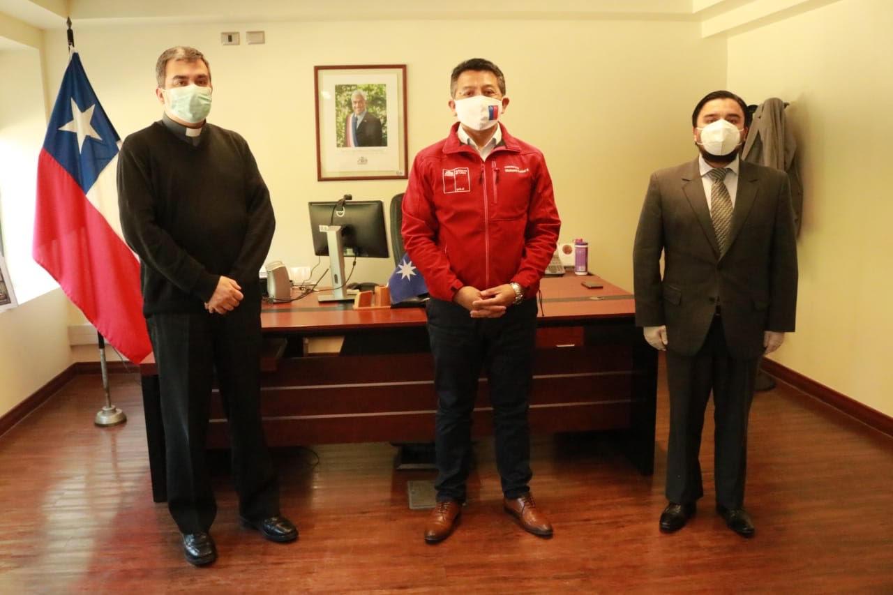 La autoridad provincial se reunió con el vicario general, Juan Andrés Basly y el pastor Matías Sanhueza, presidente del Consejo de Pastores Cristianos de La Araucanía, con el objetivo de entregar un mensaje a la ciudadanía a respetar las medidas sanitarias durante los días festivos, 31 de octubre y 01 de noviembre.