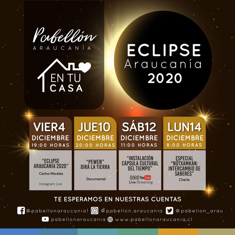 En el marco del evento más esperado del año, el Pabellón Araucanía lanzó una cobertura especial enfocada al eclipse que se desarrollará este 14 de diciembre. Es así como la charla “Eclipse Araucanía 2020” marcará el inicio de una serie de actividades a partir del 4 de diciembre (19:00 horas) y será dictada por el reconocido astrónomo de la Universidad Católica del Norte y también asesor científico del equipo Araucanía Eclipse 2020, Carlos Morales.