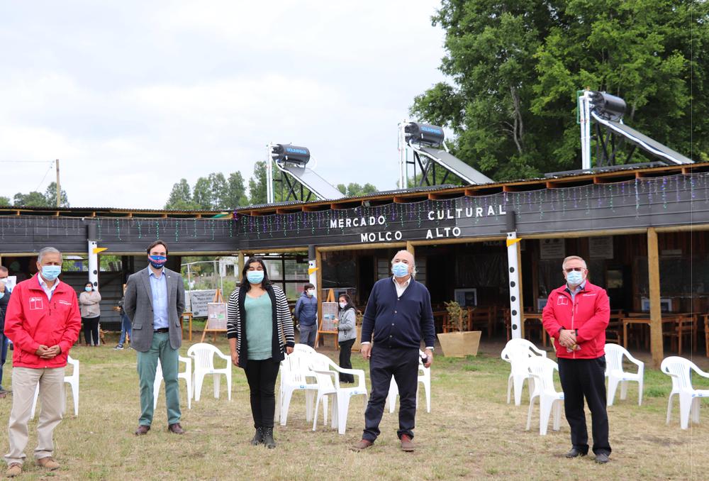 Una economía basada en productos locales, puestos en una feria con un entorno favorecido, con gente esforazada y que desde ahora aprovechan el sol para calentar su agua, ofrece la Mercado Cultural Molco Alto, en Villarrica. Erwin Gudenschwager y otras autoridades inauguraron esta obra de Energía Renovable que permite ahorros promedio de 30% en caloríficos a la asociación de empresarias que llevan esta iniciativa.