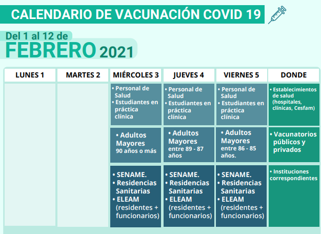 Según lo establecido, la inoculación iniciará durante la próxima semana para el personal de Salud, de Sename, de residencias sanitarias y los residentes de ELEAMs. Junto a ellos, adultos mayores de 85 años que serán convocados por separado en distintas jornadas: miércoles 3 de febrero a los mayores de 90 años; jueves 4 de febrero a los de entre 87 y 89 años; y viernes 5 a los adultos mayores entre 85 y 86 años. Los adultos mayores deberán acudir a los vacunatorios, y en caso de estar imposibilitados, contactar al Cesfam para que sean vacunados en sus domicilios.