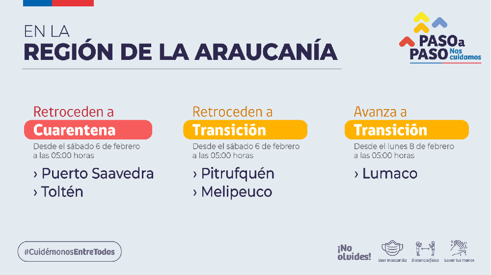 Los retrocesos para las comunas que retrocederán a cuarentena comenzarán a partir de este sábado 6 de febrero a las 05:00 horas. En esa misma fecha Pitrufquén y Melipeuco retroceden a la fase de transición.