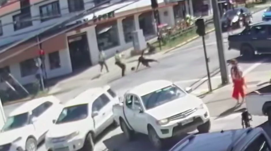 "Se observa a la víctima (Francisco Martínez) corriendo con los machetes levantados en ambas manos con dirección al carabinero, el cual retrocedía, adentrándose en la calzada vehicular ...", dice el fiscal respecto a las imágenes que muestra.